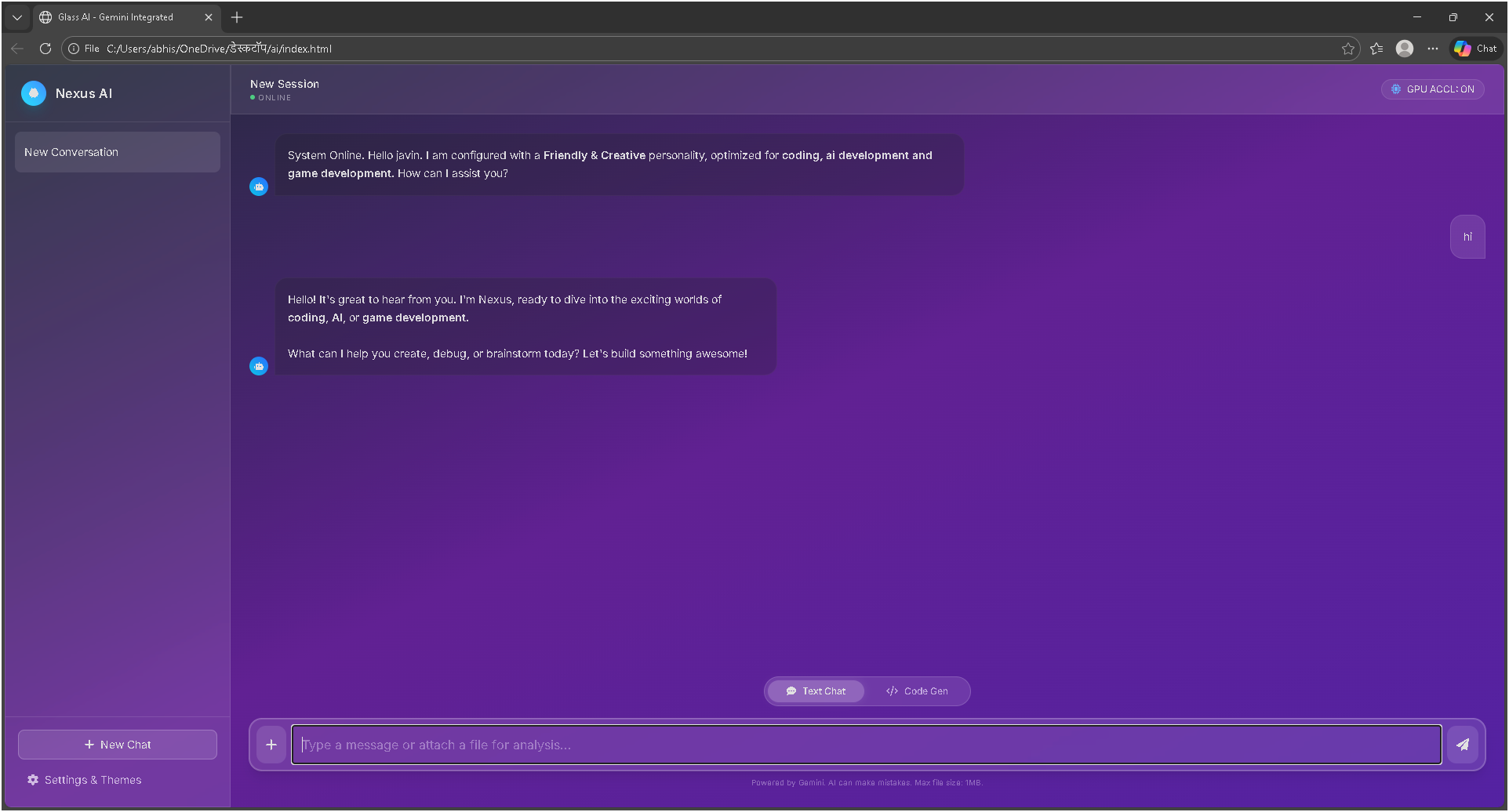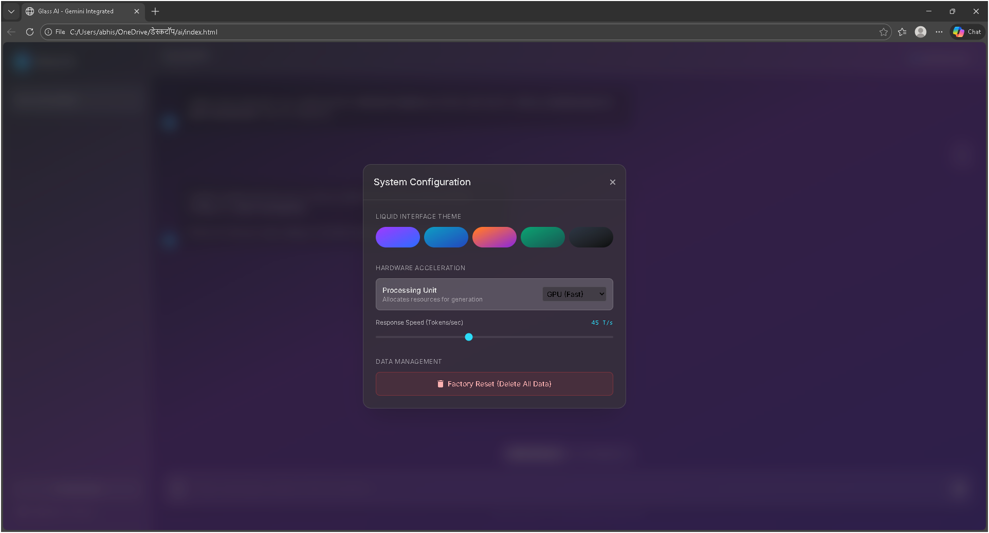 This is a ai you can run locally and it is very powerful no data tracked all private in your system , you can change the theme token per seconds and also can change that the ai is wether being processed or run on cpu or gpu. Setup your ai before use enter your passion ai personality you want and your name ai will calling you and enjoy. max tokens per second is 100 token per second .